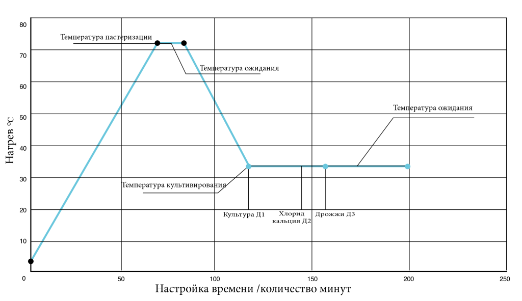 Нагрев молока до 64°C (T1), охлаждение молока до 34°C (T2), добавление культуры (Д1) и смешивание. Добавление дихлорида кальция (Д2)и смешивание.